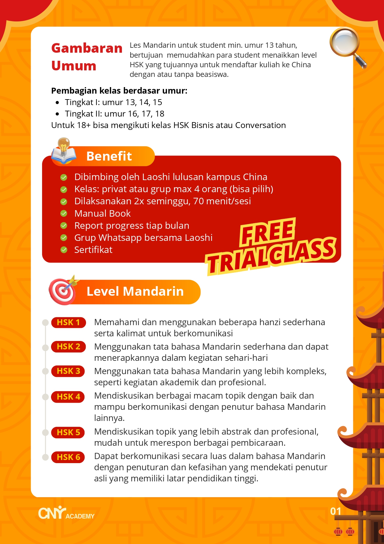 “Hallo nama saya Harold, saya berumur 17 tahun atau kelas 11. Saya bersekolah di Lentera Harapan dan mengambil jurusan IPS. Awalnya saya ingin belajar bahasa mandarin karena saya tertarik untuk kuliah di China, karena saya memperkirakan bahwa bahasa mandarin akan menjadi bahasa universal. Saya sudah belajar mandarin sekitar hampir 5 bulan di CNY. Dari kursus ini, membawa saya kepada suatu perkembangan dalam berbahasa mandarin. Sebelm kursus, saya kurang lancar dalam berbicara dan memahami bahasa mandarin. Tetapi saat ini saya mengalami kemajuan dengan mempelajari banyak vocab, walaupun masih banyak yang kurang. Kursus di CNY juga sangat nyaman, karena gurunya yang sangat terbuka dan teman-teman yang baik.”