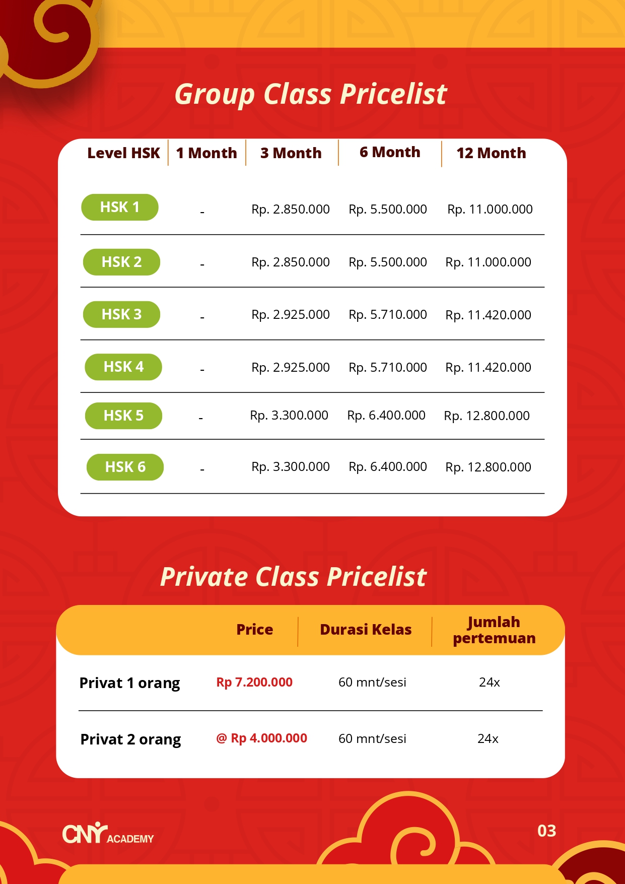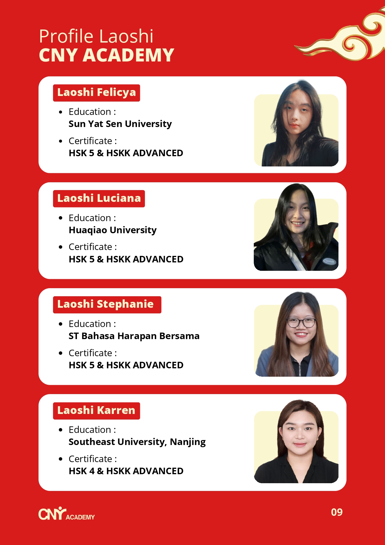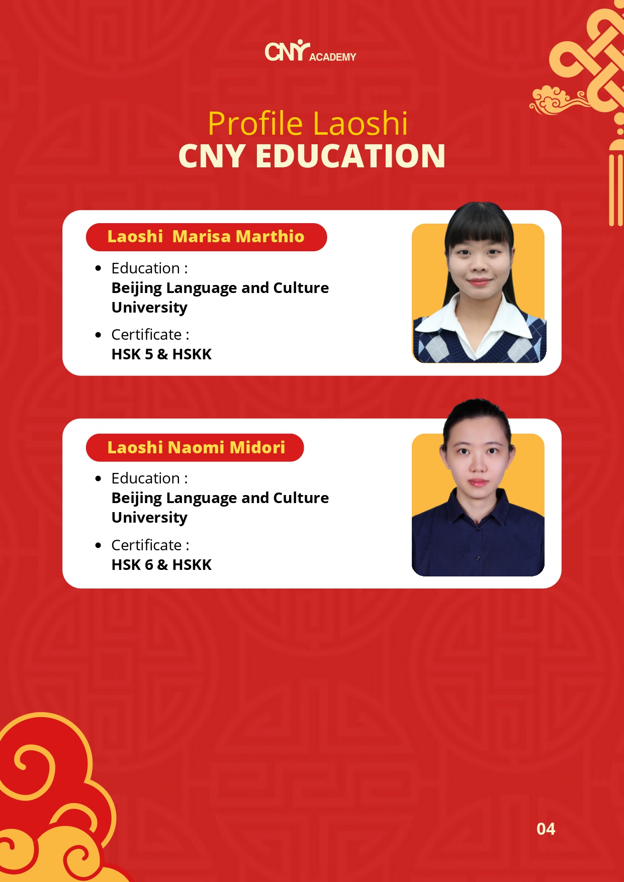 Saya sudah belajar di CNY education selama 6 bulan. Sampai saat ini, saya telah melewati ujian HSK 4 dengan nilai yang memuaskan. Suasana belajar di CNY education sangat menarik dan tidak membosankan. Gurunya juga dapat mendorong kita untuk terus.”