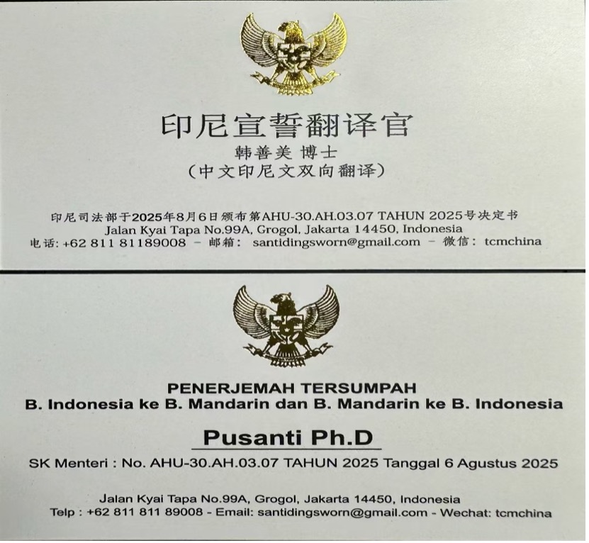 机构合伙人韩善美博士(Pusanti Ding, Ph.D.)为印尼司法部授权的宣誓翻译,提供中文—印尼文双向宣誓翻译服务和海牙认证服务。她的服务专业、可靠、精准、保密。